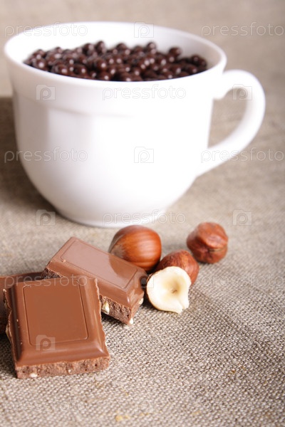 Шоколадные шарики в чашке, орехи и дольки шоколада