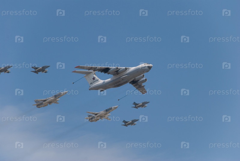 Самолеты в голубом небе в день парада над Красной площадью