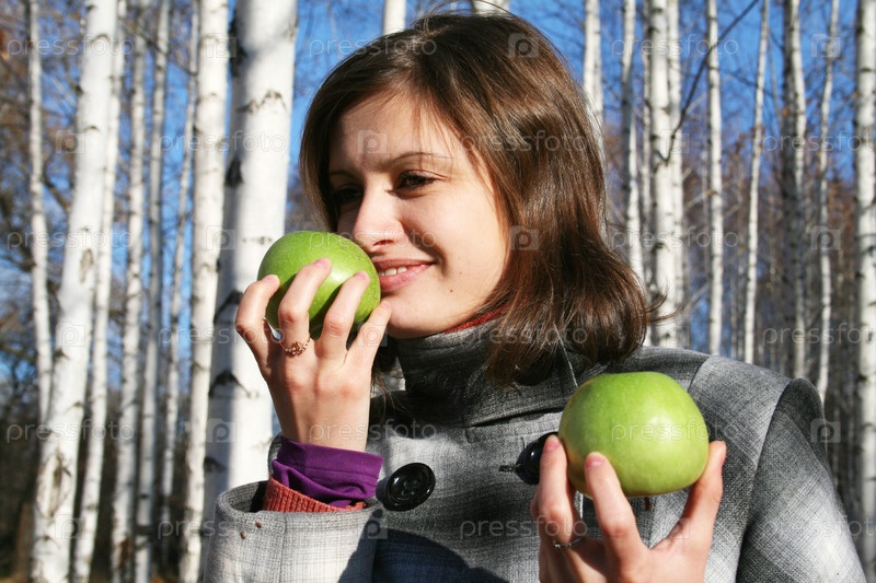 Молодая девушка в клетчатом пальто нюхает два зеленых яблока