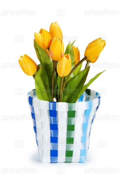 Букет желтых тюльпанов в горшке на белом фоне