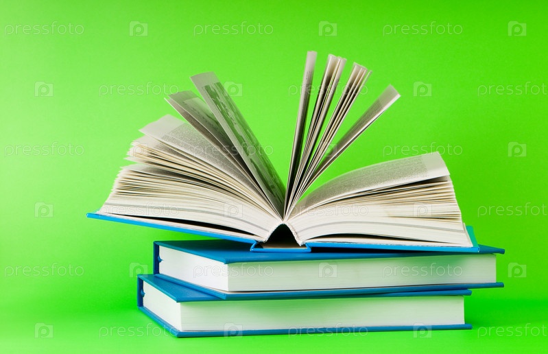 Стопка книг на зеленом фоне крупным планом