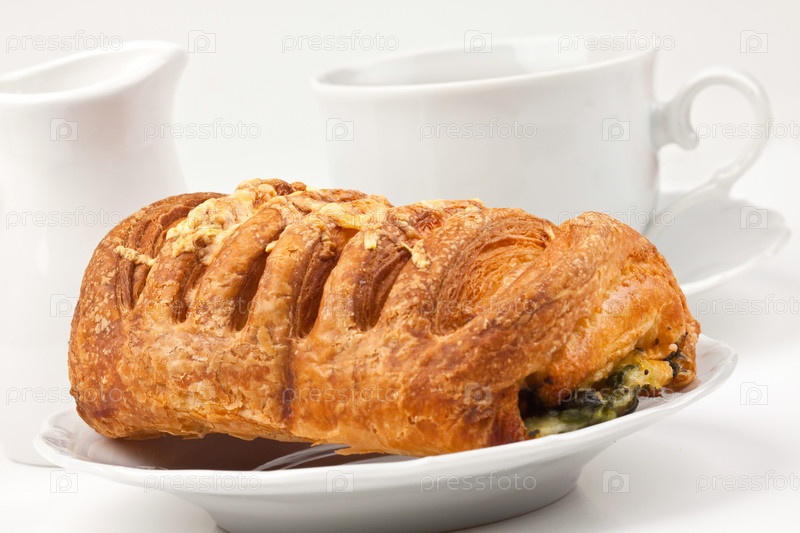 Чашка кофе и булочка с сыром и шпинатом