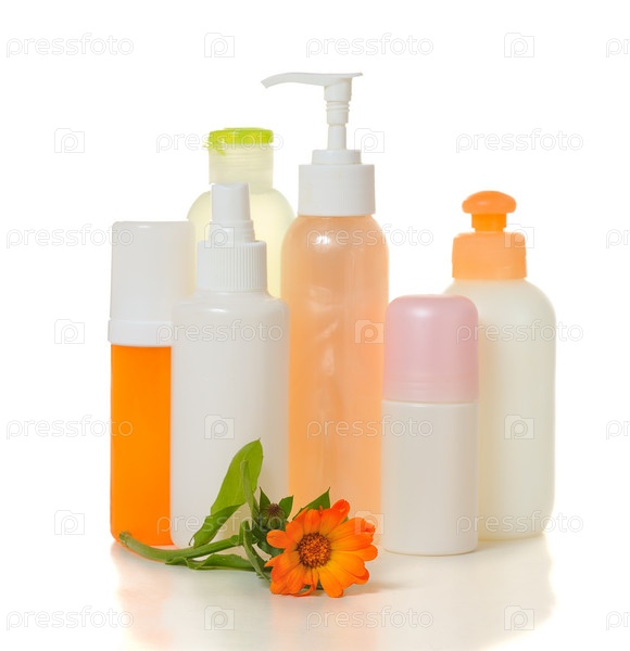 Флаконы с косметическими средствами на белом фоне
