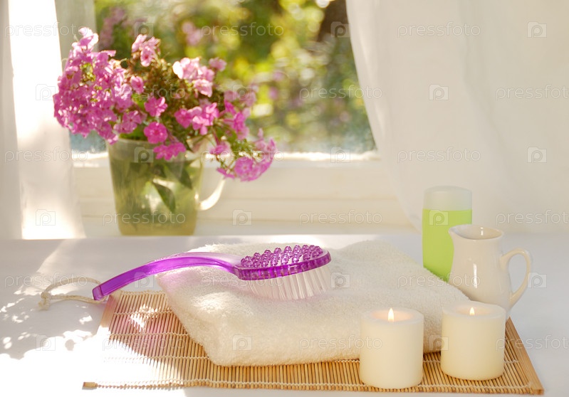 Полотенце, свечи, щетка и букет