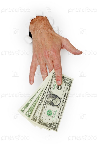 Рука держит пачку денег на белом фоне