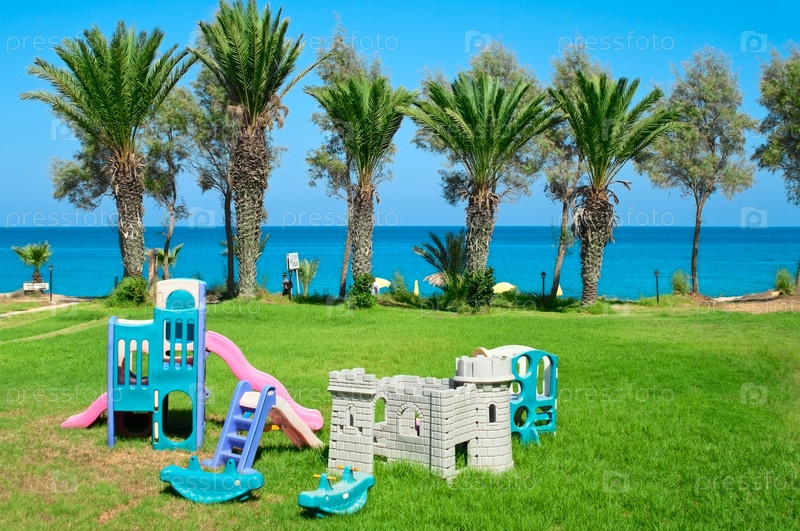 Детская площадка на лужайке недалеко от моря