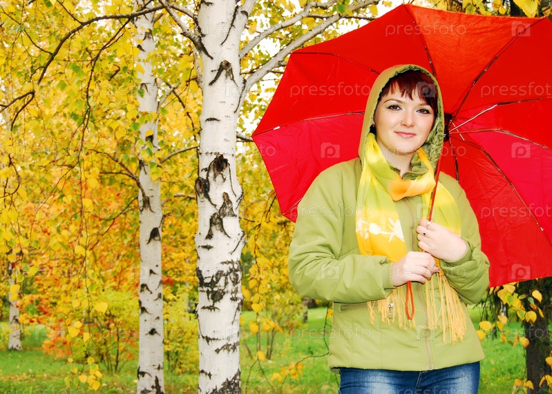 Привлекательная девушка с зонтом в руках стоит у березы