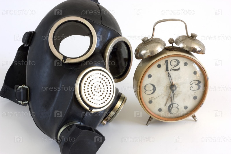 Противогаз и будильник на белом фоне