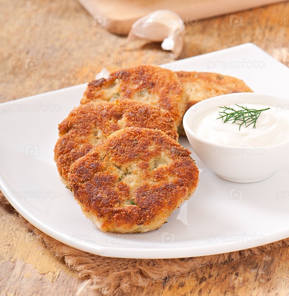 Котлеты из цветной капусты с соусом из укропа, чеснока и сыра