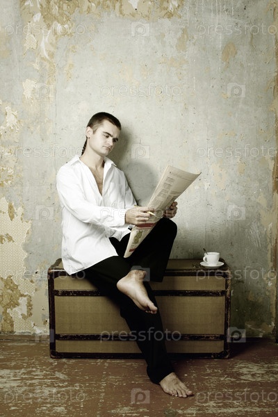 Молодой человек читает газету, сидя на чемодане в пустой комнате