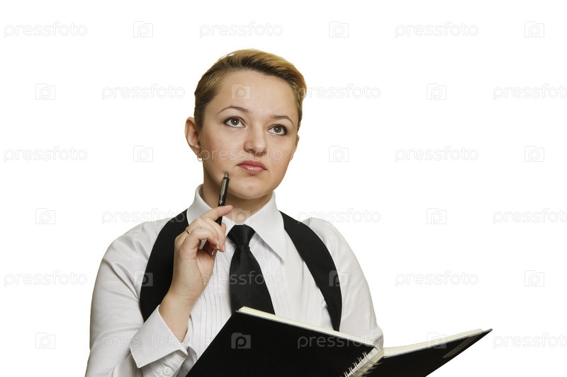Портрет задумчивой женщины в галстуке на белом фоне
