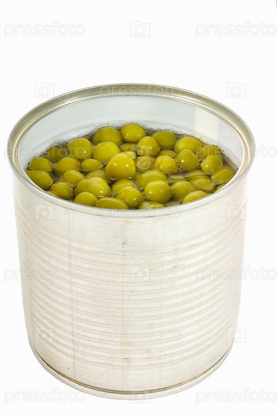 Банка зеленого горошка на белом фоне