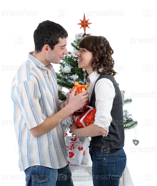 Счастливая пара дарит друг другу подарки