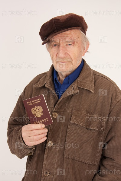 Пожилой мужчина в куртке держит в руке паспорт