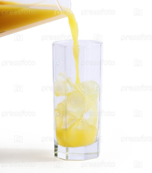 Апельсиновый сок наливают в стакан со льдом