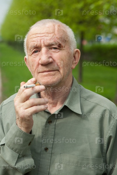 Пожилой мужчина на улице с сигаретой в руке