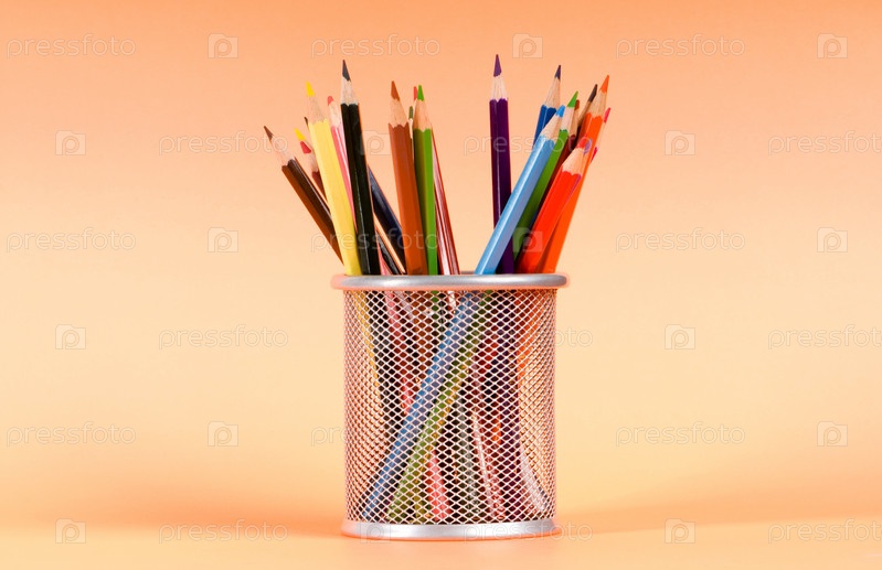Цветные карандаши в стакане на оранжевом фоне