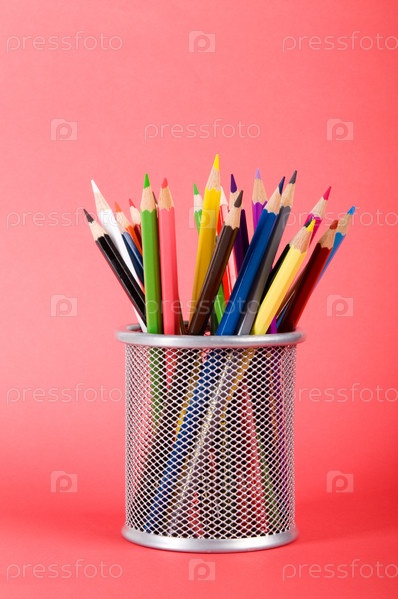 Цветные карандаши в стакане на розовом фоне