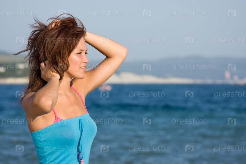 Молодая девушка позирует на берегу моря