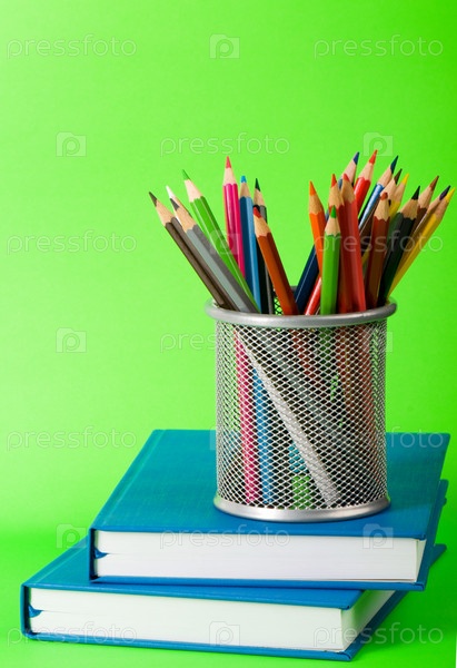 Цветные карандаши на книгах на зеленом фоне