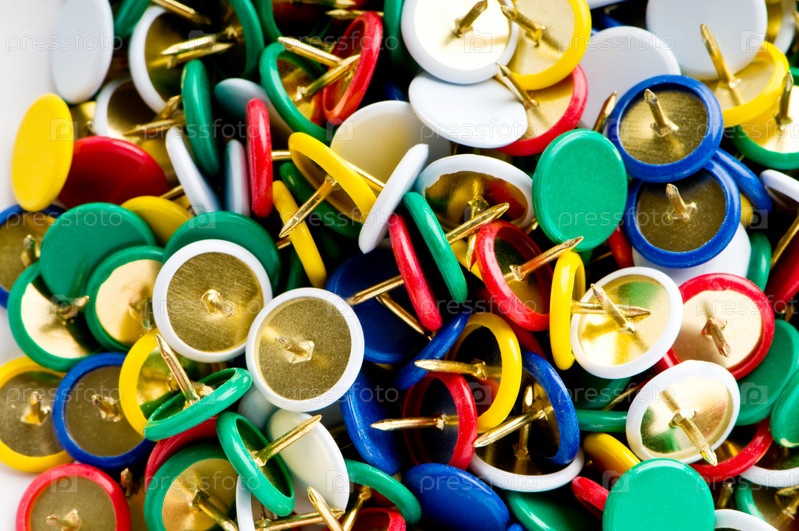Куча разноцветных канцелярских кнопок на белом фоне