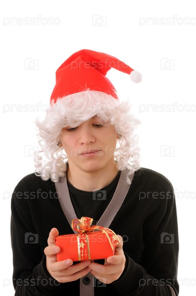 Подросток в новогоднем колпаке, держащий подарок