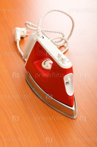 Красный электрический утюг крупным планом на деревянном полу