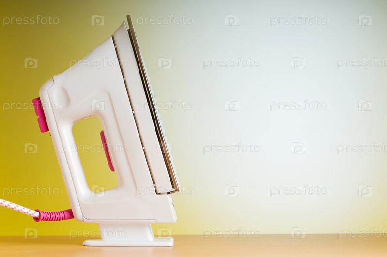 Белый электрический утюг на фоне желтой стены крупным планом
