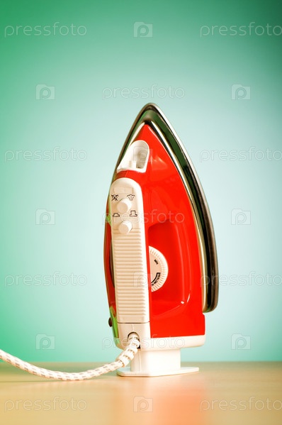 Красный утюг на фоне зеленой стены крупным планом