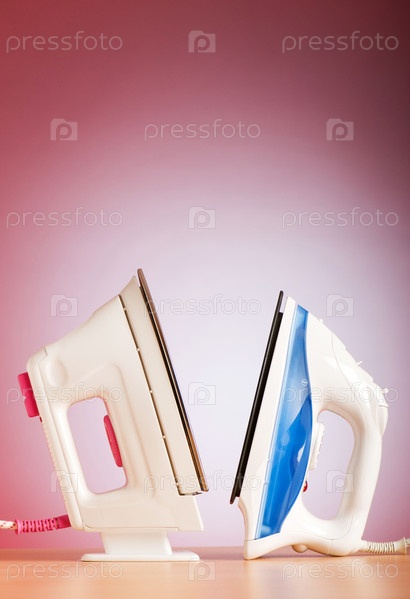 Два утюга стоят напротив друг друга на фоне розовой стены крупным планом