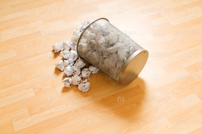 Опрокинутая корзина с мусором на деревянном полу крупным планом