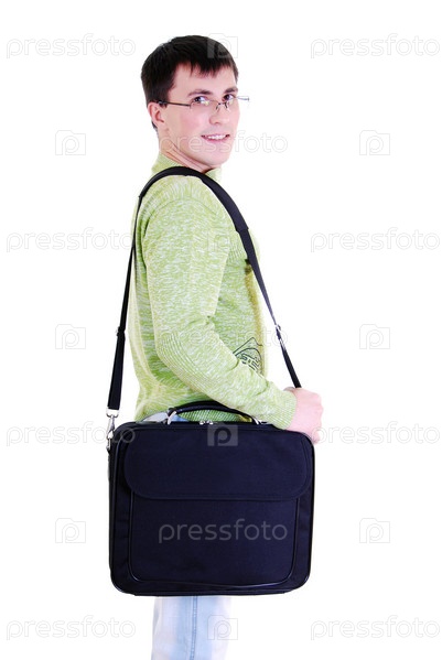 Молодой мужчина с портфелем на белом фоне