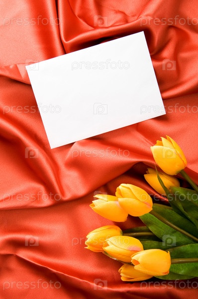 Белая открытка и букет тюльпанов на атласной ткани крупным планом