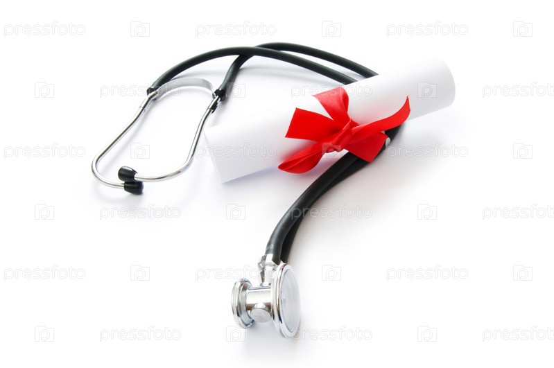 Медицинский стетоскоп и диплом на белом фоне