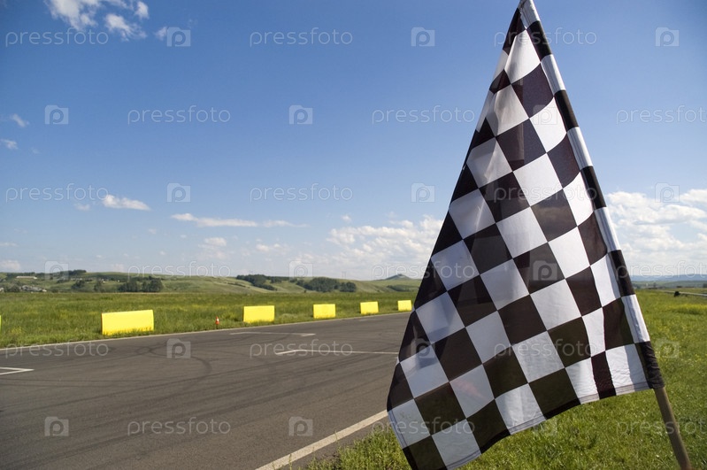 Клетчатый флаг на фоне автомобильного трэка