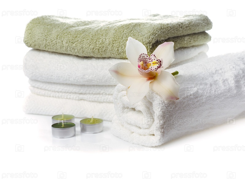 Стопка полотенец с цветком орхидеи на белом фоне
