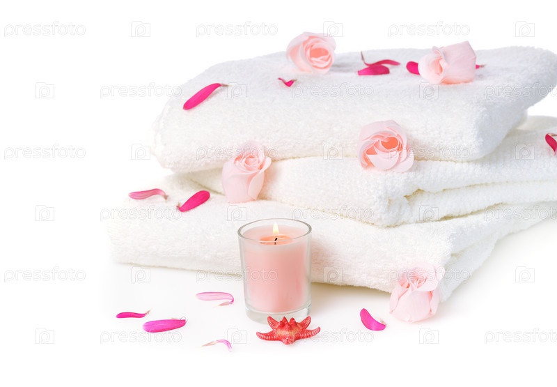 Белые полотенца с розовым мылом и свеча на белом фоне