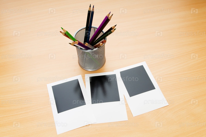Пустые фоторамки для фотографий и стакан с карандашами на столе