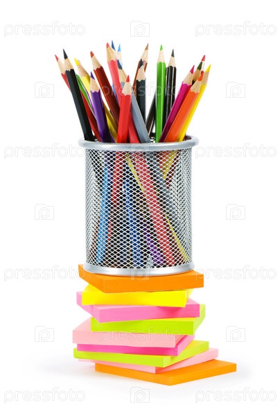 Цветные карандаши в стаканчике, стоящие на бумаге для заметок на белом фоне