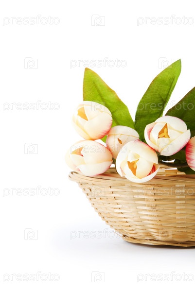 Тюльпаны в корзинке на белом фоне