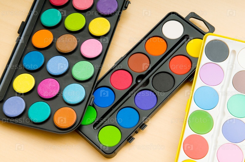 Три набора красок на столе
