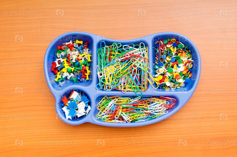 Разноцветные скрепки и канцелярские кнопки в голубом футляре на коричневом фоне