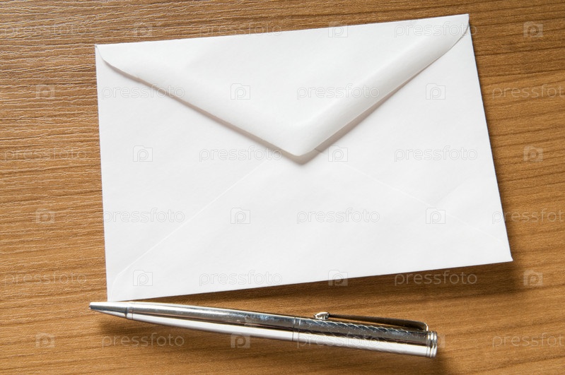 Шариковая ручка и почтовый конверт лежат на столе
