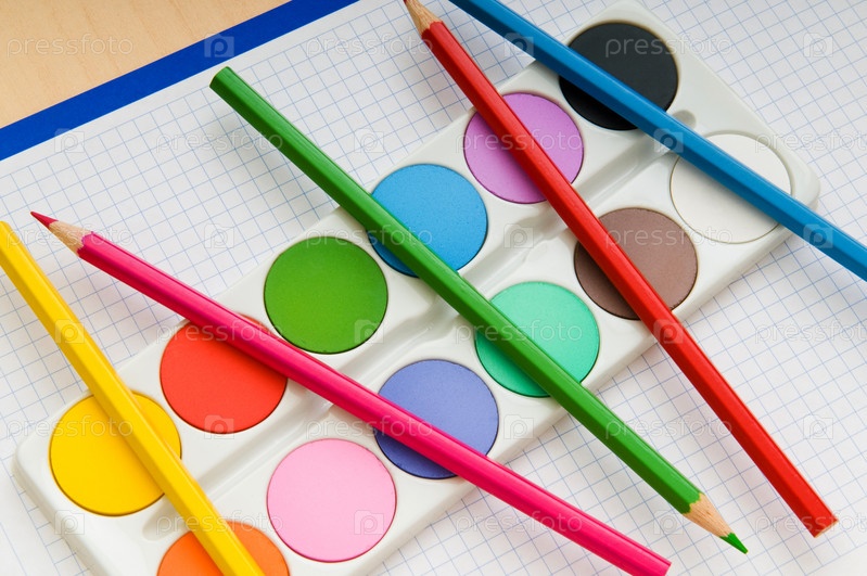 Чистый лист бумаги с цветными карандашами и красками на бежевом фоне
