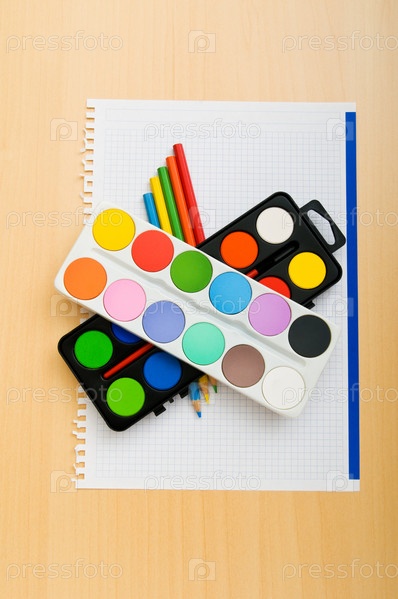 Чистый лист бумаги с разноцветными карандашами и красками на бежевом фоне