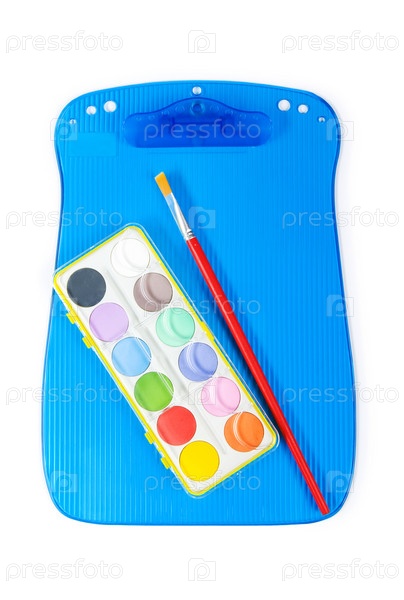 Кисть и разноцветные краски на голубой доске