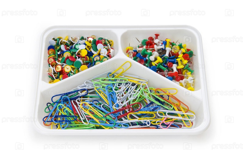 Канцелярские принадлежности в пластиковом контейнере на белом фоне