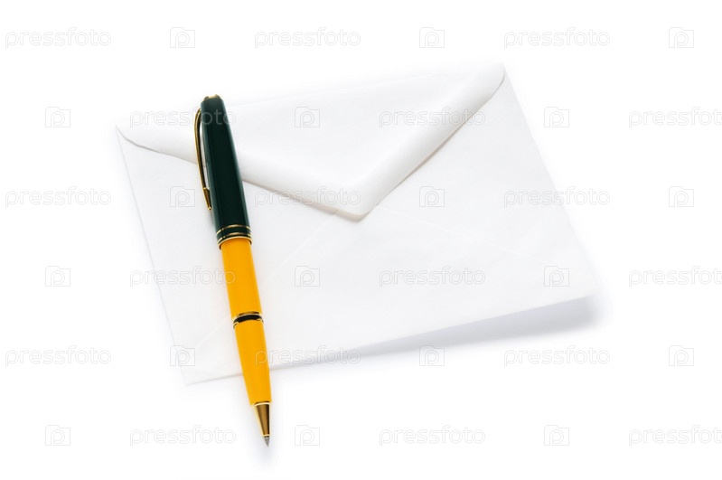 Шариковая ручка с конвертом на белом фоне