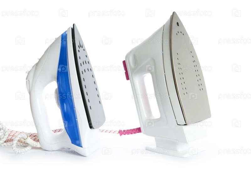 Два современных бытовых утюга на белом фоне