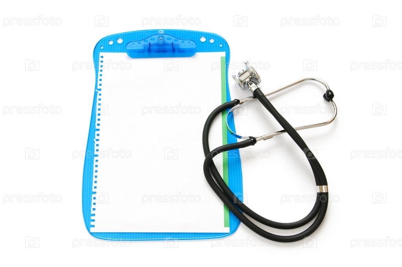 Стетоскоп и планшет с бумагой на белом фоне
